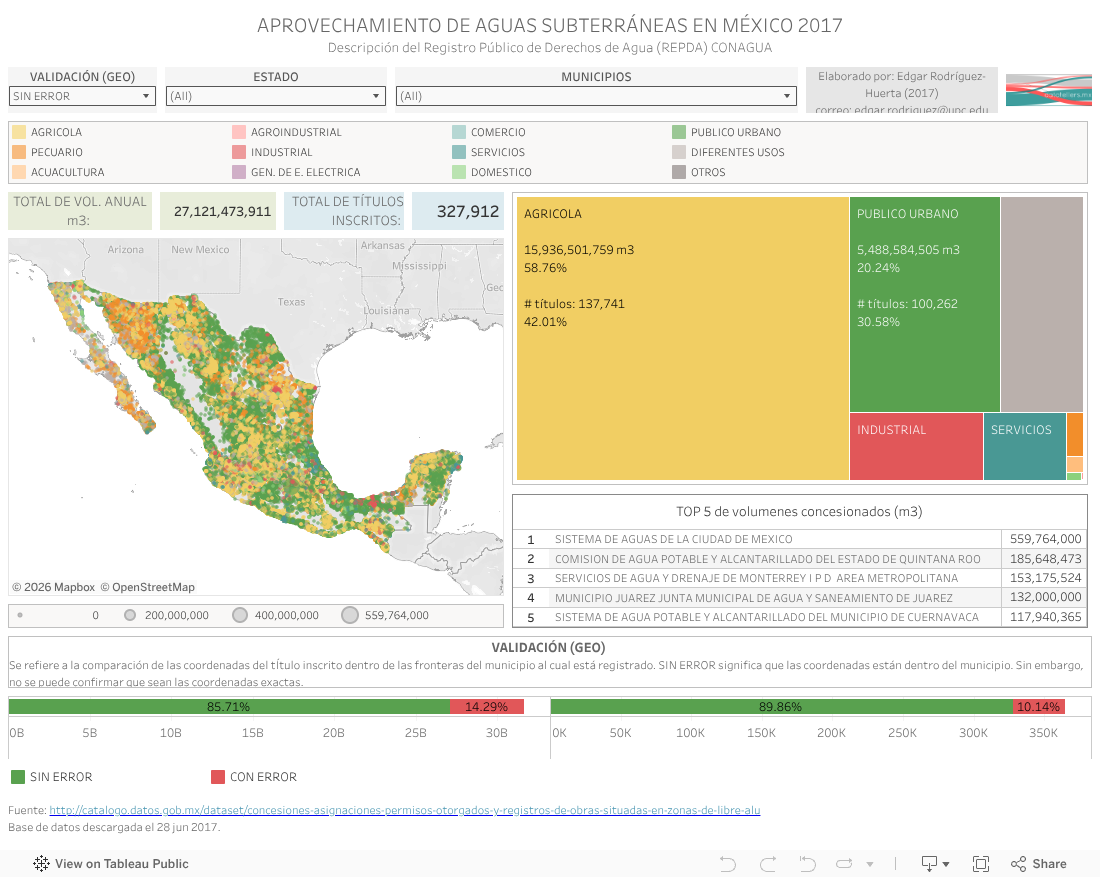 A diferencia de la visualización oficial de CONAGUA en SINA, la siguiente visualización permite analizar el total de títulos inscritos en el REPDA a un nivel municipio y uso cosuntivo de forma simultanea, además de que se filtran los títulos en los que se detectó errores en las coordenadas descritas en el REPDA.